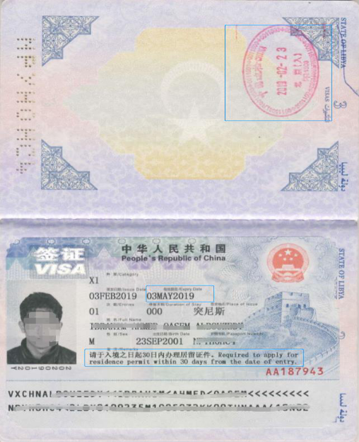 请注意“有效期至03MAY2019”,此处是中国境外X1签证的有效期,一般自签发之日起三个月有效,请不要与入境后X1签证30天有效期相混淆。
