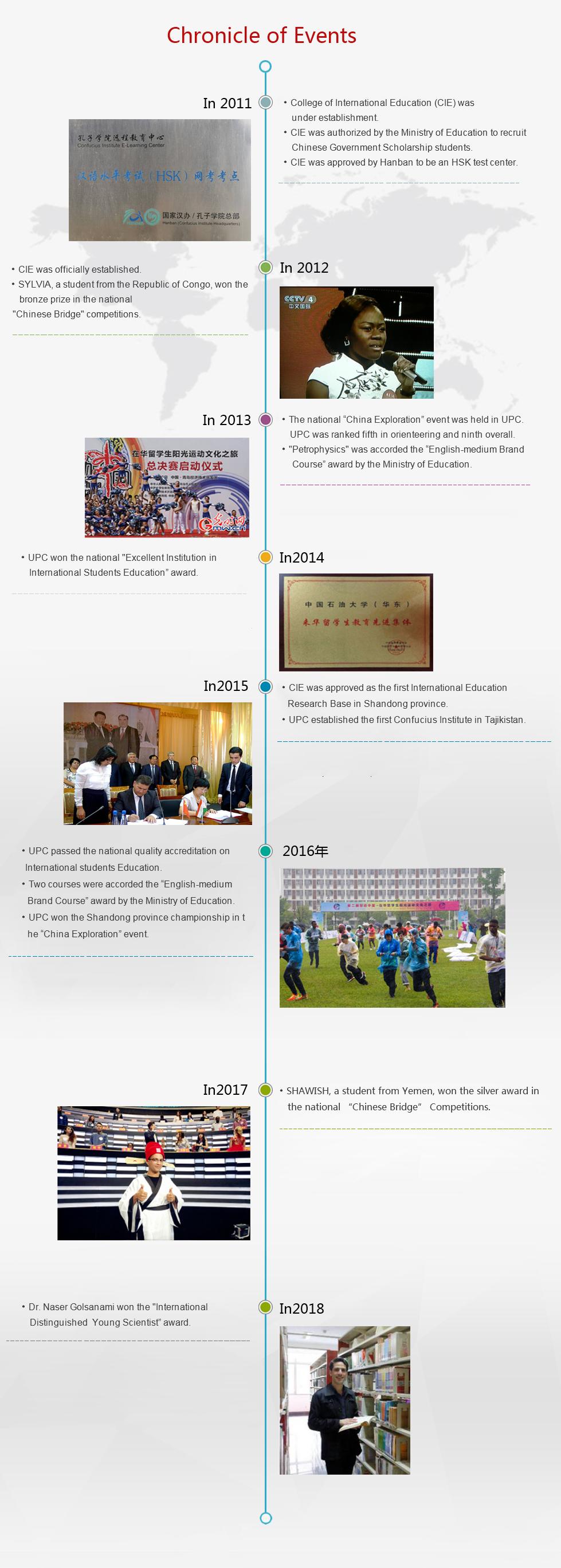 In 2012, College of International Education (CIE) was officially founded in response to the internationalization strategy of China University of Petroleum. CIE is a comprehensive institution of international students administration and research, including international student admission, management, international promotion of Chinese language.