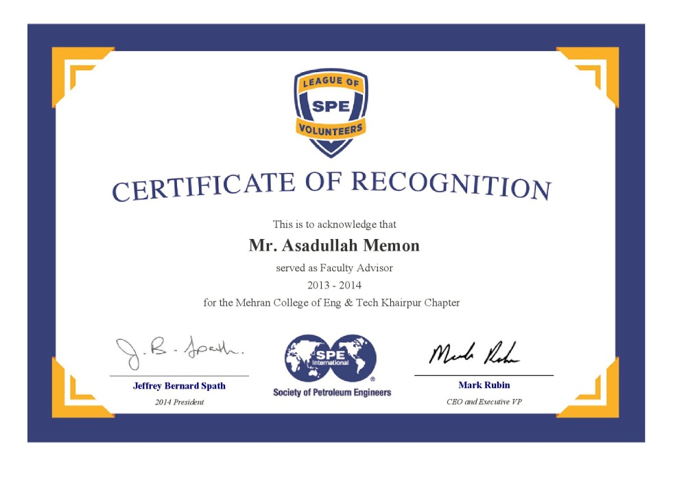 Asadullah Memon has been working as Assistant Professor in Mehran University of Engineering & Technology (SZAB Campus Khairpur) at Pakistansame. He is a founder and was first faculty advisor of SPE Student Chapter, “Mehran University College of Engineering and Technology Khairpur Mirs 6096” and served as a faculty Advisor of this chapter from 2012 to 2014. During his tenure, he organized many successful events in national level, promoted and uphold the SPE educational activities, created healthy environment for the young engineers to harness their strength in collaboration with the industry and recognized chapter as a Gold Standard student chapter.