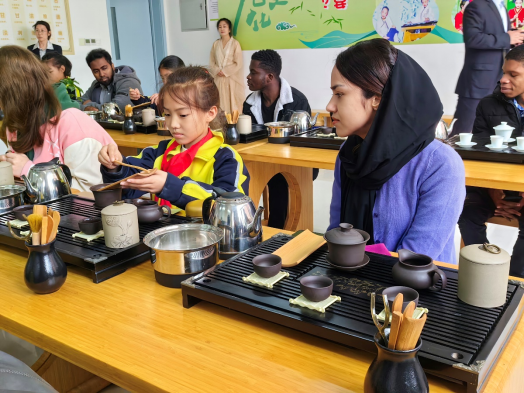 International students participated the Tea Art class with primary school students. They learnt the basic ceremony of tea, the six major Chinese tea, and received a gift of small pots of tea.