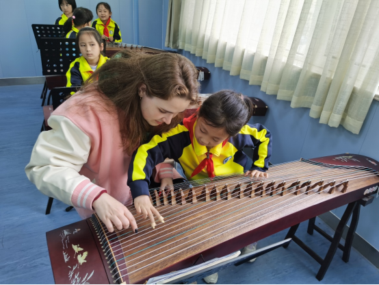 International students enjoyed the performance of“Jasmine flower” by primary school students in the Guzheng classroom and experienced the Guzheng performance for themselves.