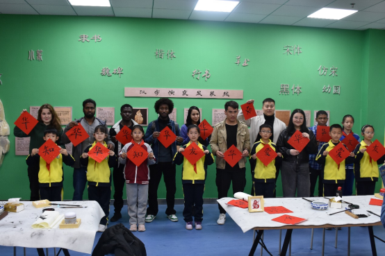 International students learn to write Chinese characters with a brush in a Chinese character classroom. Together with the pupils, they wrote“知华”, “友华” and“爱华”.