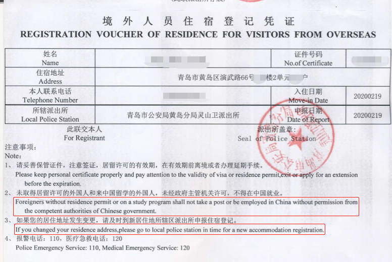 Students should carefully check the information in the Registration Voucher of Residence for Visitors from Overseas and ask the police to correct it on site if there is any mistake. Otherwise, it would affect the processing of visa or residence permit.