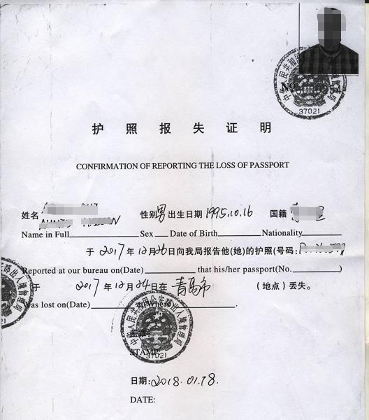 3. Submit the copy of passport, copy of JW201/202 (provided by the Visa Office) and the handwritten statement to theEntry-Exit Administration of Qingdao Public Security Bureauand then collect a loss certificate.