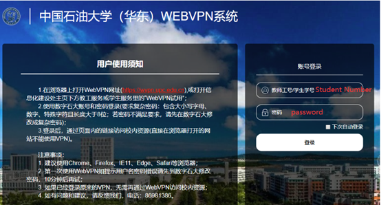2. Login webvpn:https://wvpn.upc.edu.cn/login. Username and password are the same used for Digital UPC. Default username is your student number, and the password is the complicated one you have reset in first step.
