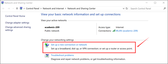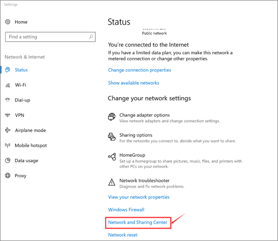 , choose “open network & internet settings”. In the Settings window, click on “Network and Sharing Center”.