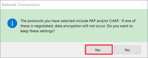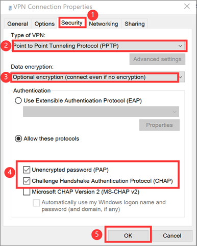 4. On the “security” card, choose the type of VPN, Data encryption, tick “unencrypted password”, and “Challenge Handshake Authentication Protocol”, then click on “OK”.