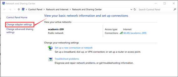 2. In the Network and Sharing Center window, click on “Change adapter settings”