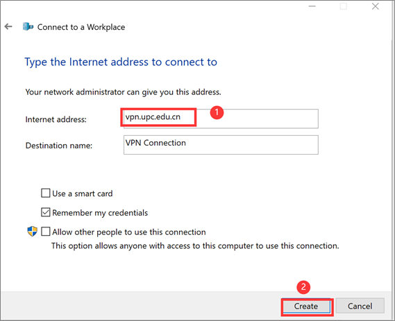 5. Type in the address of the VPN server: vpn.upc.edu.cn, then click on “create”
