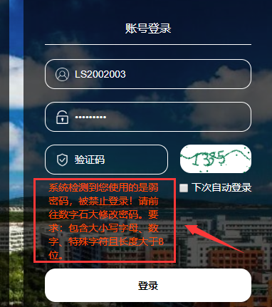 Note: The password for webvpn should contain capital letters, small letters, special characters and digitals, and no less than 8 characters. If the password cannot meet the requirement, the following message will be shown and students must login the Digital UPC (http://cas.upc.edu.cn/cas/login) to restet the password.