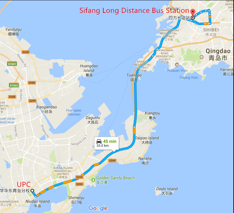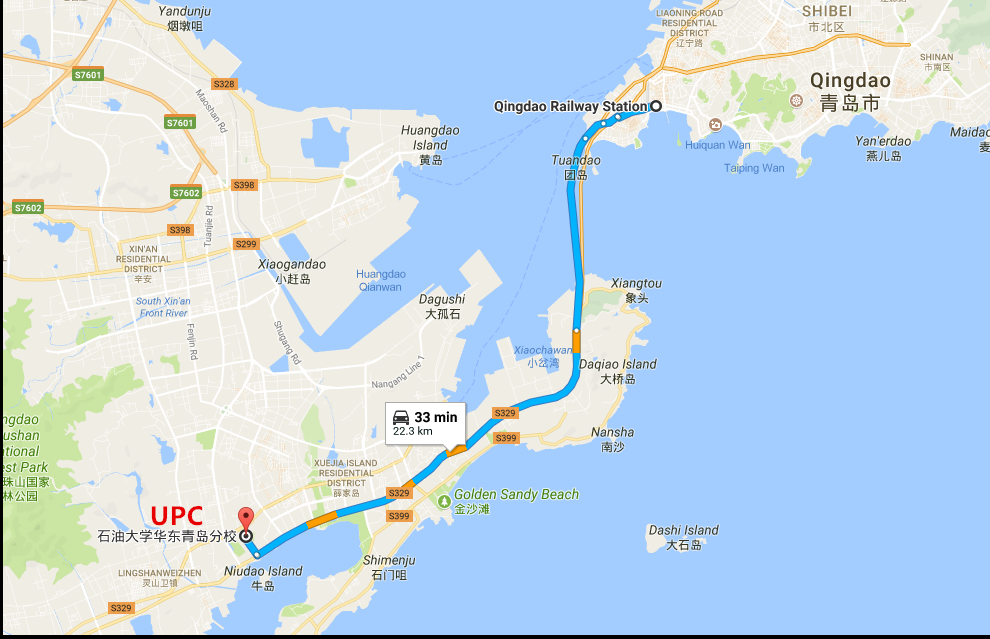 青岛流亭国际机场会于青岛市西北部,距中国石油大学70公里。学生可乘坐出租车到校,约1小时车程,约200元人民币。