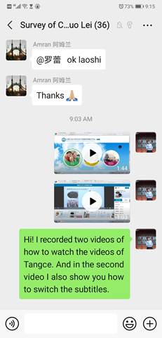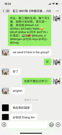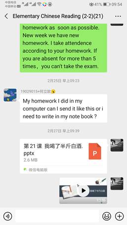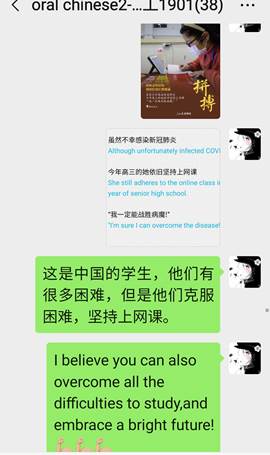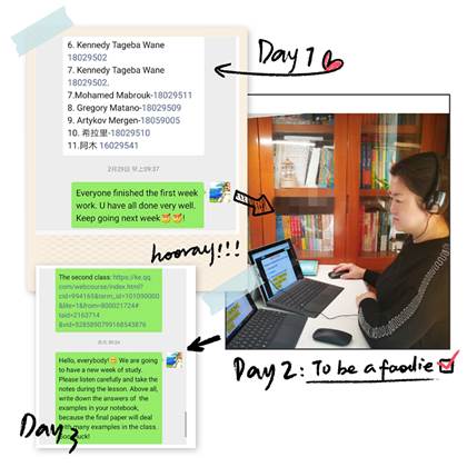 留学生任课教师精心准备网课,充分利用云课堂、智慧树、雨课堂、钉钉、知到、慕课、学习通、腾讯课堂等多种平台开展教学,同时通过先期建立的课程微信群等多种方法,对学生进行平台和软件使用培训、发布学习计划、资料和作业,为国际学生进行线上交流答疑,师生双方较快地适应了这一新的学习形式。比如,理学院董鹏老师制作了英文版“学习通”安装使用说明,解决了部分国际学生无法安装“学习通”英文版本的问题。她说:“现在上传视频,发布通知,发布作业和测试题,其实要比线下方便多了。”老师们还通过线上授课向学生宣传防疫知识和学校有关疫情控制的相关规定,如文法学院张袁月老师通过“战疫故事”激励学生努力学习。