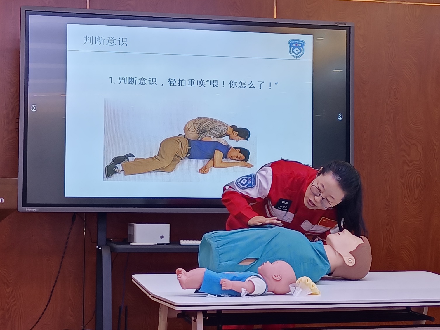最后,留培楼物业前台负责人暨青岛红十字蓝天救援中心的相关资格讲师杨晓灵做了题为《心肺复苏及AED的使用》的讲解,并现场演示心脏复苏术的实施方法。