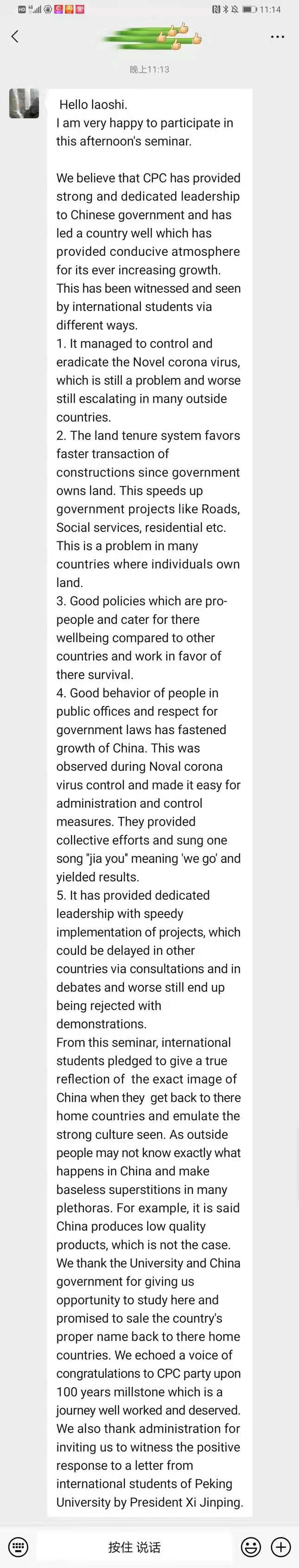 来自乌干达的2019级博士研究生皮特感到十分激动,他提到,新冠肺炎疫情暴发以来,中国采取有效措施抗击疫情并取得难以想象的成效,并对其他国家提供及时援救,为全球抗疫作出了巨大贡献。阶段性的抗疫胜利让他看到了中国政府的强大号召力和中国人民的众志成城凝聚力,也让他坚定了继续在中国留学的信心和决心。在未来,他还要进一步深入地了解中国,了解中国共产党,并将优秀的中国思想、传统文化,政策和制度带回非洲,努力建设世界美好家园。
