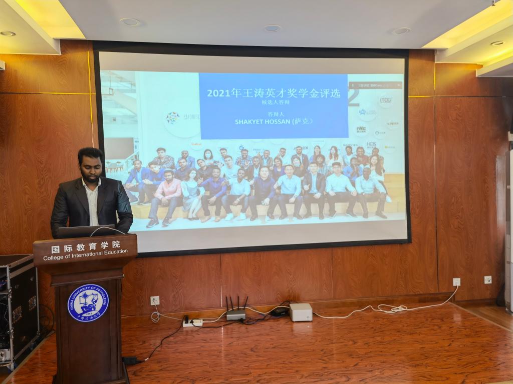 答辩会伊始,主持人盖超老师向与会人员介绍了王涛英才奖学金的初衷与愿景以及国际学生奖学金评选规则,随后10名候选人向专家评委依次展示介绍了自己在校期间论文科研、学生工作、社会活动等方面的取得的成绩。答辩结束后,由专家评委进行投票,最终确定王涛英才奖学金推荐人为2019级孟加拉籍本科生SHAKYET HOSSAN(中文名:萨克)。
