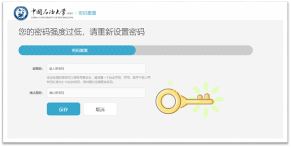 1.当用户密码为简单密码时,登录数字石大时,会直接进入修改密码界面。输入符合密码强度要求(包含字母、数字、符号,且长度为8-16位的密码)的新密码。
