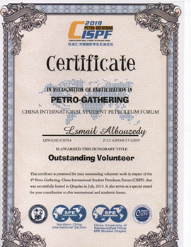 从留学生会积累的一定的工作经验后,我成为了SPE学生分会外联部的部员,在SPE学生分会期间我参与组织的活动的规模是以前从未见识过的。我参与了中国国际学生石油论坛的组织工作。与此同时,我还参与了学校的各类有关中国传统文化及中外文化交流的活动,并获得到一些奖项像如中外联谊部的汉语演讲比赛二等奖,党委宣传部的汉字听写大赛一等奖等。