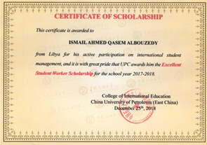 伊斯梅尔(Ismail A .Q. Albouzedy),1998年九月生,利比亚/菲律宾人,本科生大三学生,就读于中国石油大学(华东)石油工程专业,分别为UPC留学生会和SPE学生分会工作,参与组织各种中外和校内外的活动如,石油汇中国国际学生石油论坛,国际文化祭,语言角等有益于中外文化交流的活动。曾获得汉字听写大赛一等奖,汉语演讲比赛二等奖,留学生会优秀部员。荣获优秀学生工作者奖学金与青岛政府奖学金等奖项。
