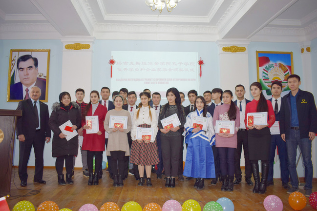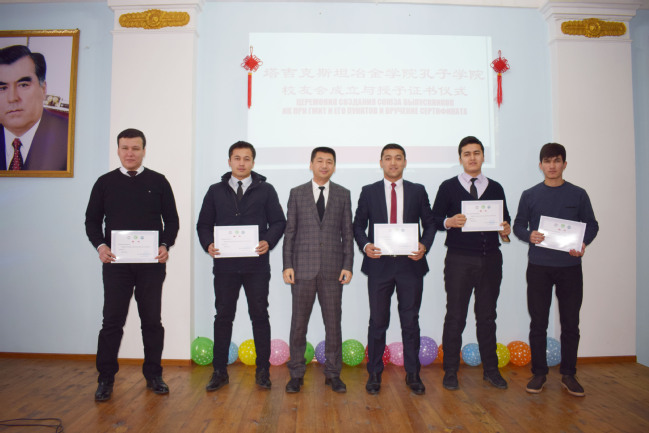 塔吉克斯坦冶金学院孔子学院成立五年来,培养了四千多名学生,为推进孔子学院的建设与发展,增强孔子学院学员凝聚力和向心力,进一步推动中塔两国文化交流,塔吉克斯坦冶金学院正式成立孔子学院校友会。孔子学院中方院长任耕田为首批校友会组织员颁发聘书,并希望他们为完善孔子学院建设积极献言献策。