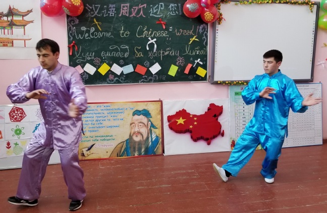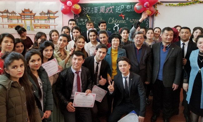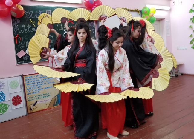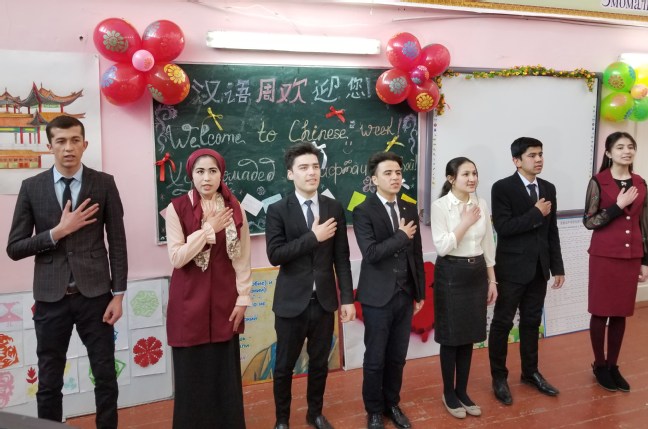 “汉语周”活动的最后一天,在胡占德国立大学汉语-英语系的大阶梯教室里组织了汇报演出活动,汉语-英语系主任伊斯洛姆、相关教研室的领导和教师,以及塔吉克斯坦冶金学院孔子学院中方院长陈洪兵、外方院长扎法尔都出席了汇报演出活动。活动一开始,学生演员们首先在台上用塔吉克语和汉语分别演唱了塔吉克斯坦国歌和中国国歌,台下的观众也自发地和他们一起合唱,现场充满了中塔一家亲的气氛。
