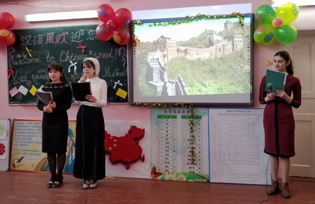 “汉语周”活动期间学生们自己制作了有关中国名胜古迹的PPT,并在汇报演出时用汉语和塔吉克语向观众做了讲解。讲解活动图文并茂,两种语言同时使用,达到了很好的效果,给在场的观众留下了深刻的印象。