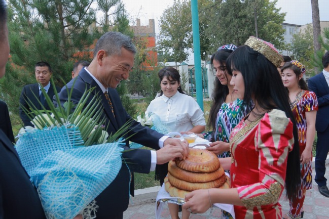 孔子学院学员向来宾献上塔吉克馕和蜂蜜