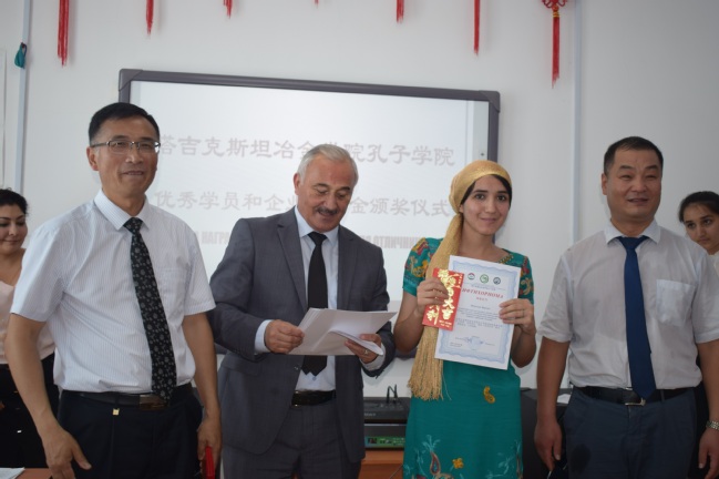 孔子学院外方院长扎法尔教授首先致欢迎辞,他对来宾表示了欢迎,并对支持孔子学院发展的各界朋友表示了感谢。他回顾了本学期孔子学院教学和文化活动方面的工作,对孔子学院中外方工作人员辛勤的劳动和取得的丰硕成果表示了感谢和祝贺。讲话结束前,扎法尔教授还代表塔方向孔子学院所有的中方工作人员赠送了塔国的传统礼物。