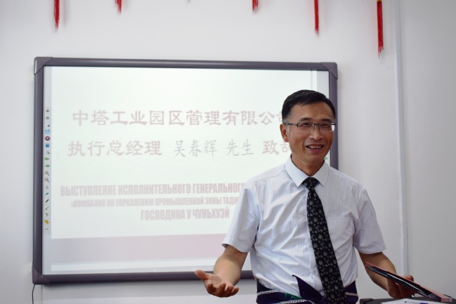 中塔工业园区管理有限公司执行总经理吴春辉在讲话中,回顾了企业和孔子学院合作的历史,祝贺了孔子学院本学期取得的新成绩,阐述了企业和孔子学院合作的新模式:企业将为孔子学院奖学金生提供就业机会,并为他们在中国学习期间提供一次往返的国际机票。活动现场的气氛再一次被推向了高潮。