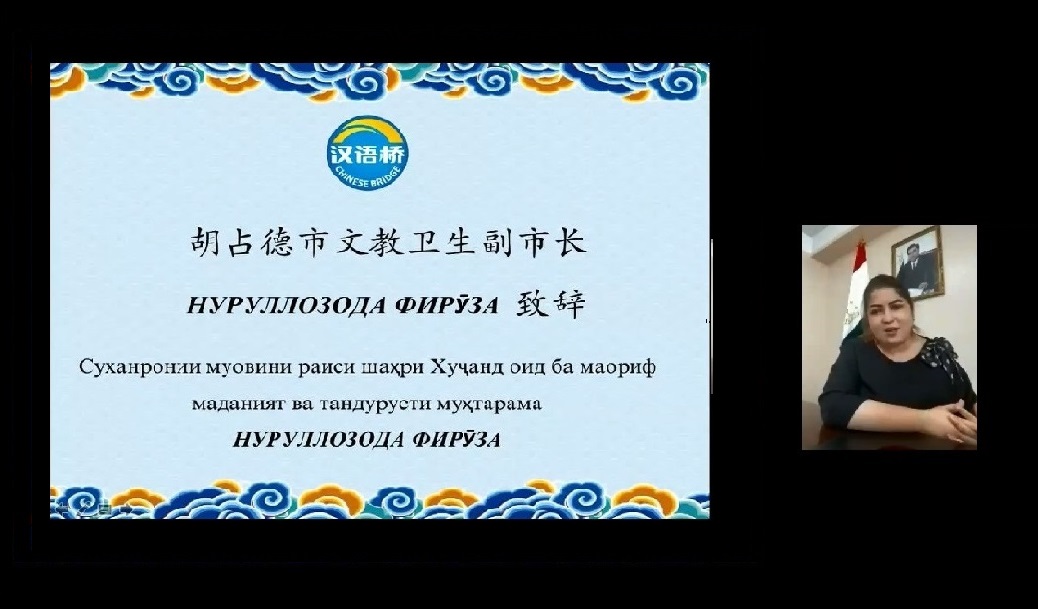 胡占德市文教卫生副市长努鲁洛佐达·菲茹扎表示, “汉语桥”比赛已经成为塔中两国间重要的文化和教育交流活动。她对孔子学院为塔、中两国在教育和文化交流工作中做出的努力表示感谢。