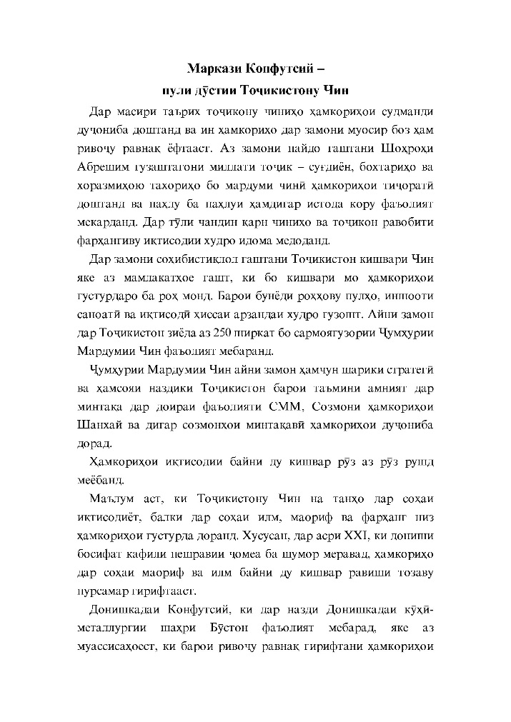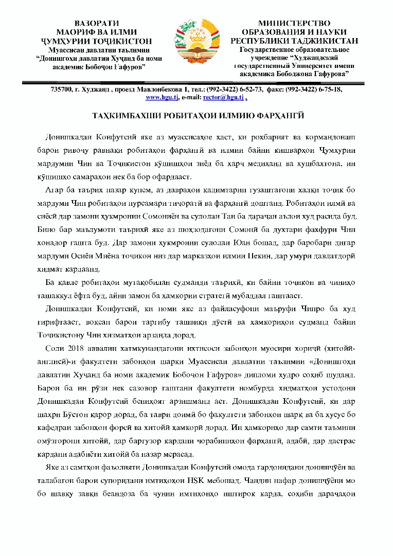 塔吉克斯坦胡占德市文教卫生副市长 努鲁洛佐达·菲茹扎在贺信中指出塔中交往源远流长。塔吉克斯坦孔子冶金学院孔子学院是塔中两国开展和推动科研教育合作做出重要贡献的机构典范,为促进塔中两国语言和文化交流做出了巨大贡献,已经成为连接两国人民之间友谊的坚实桥梁。