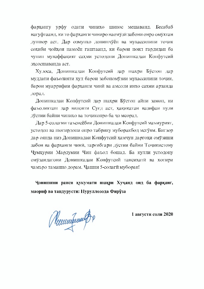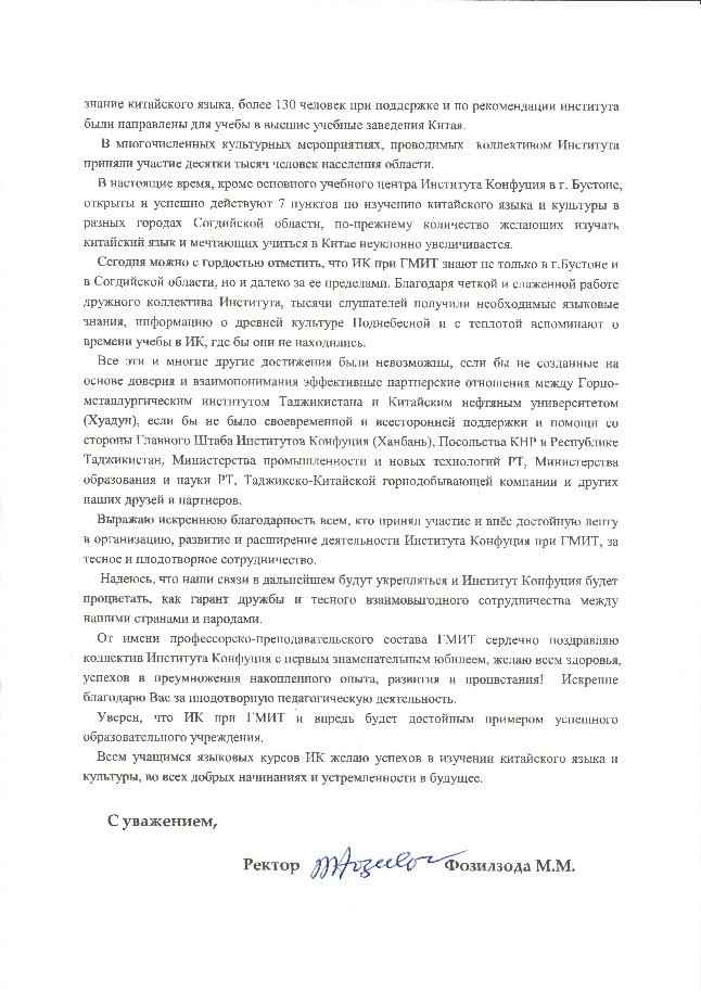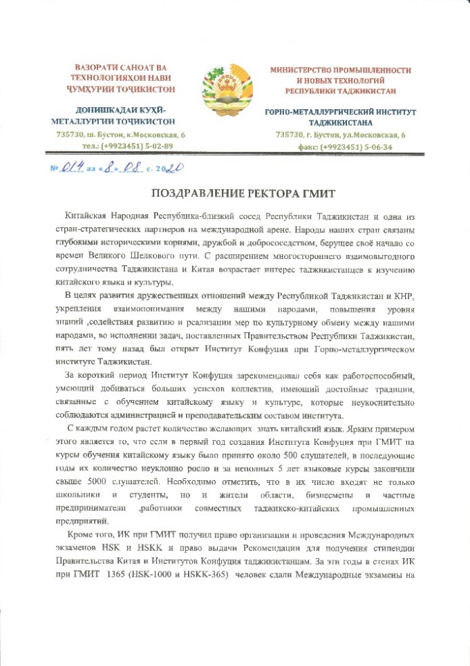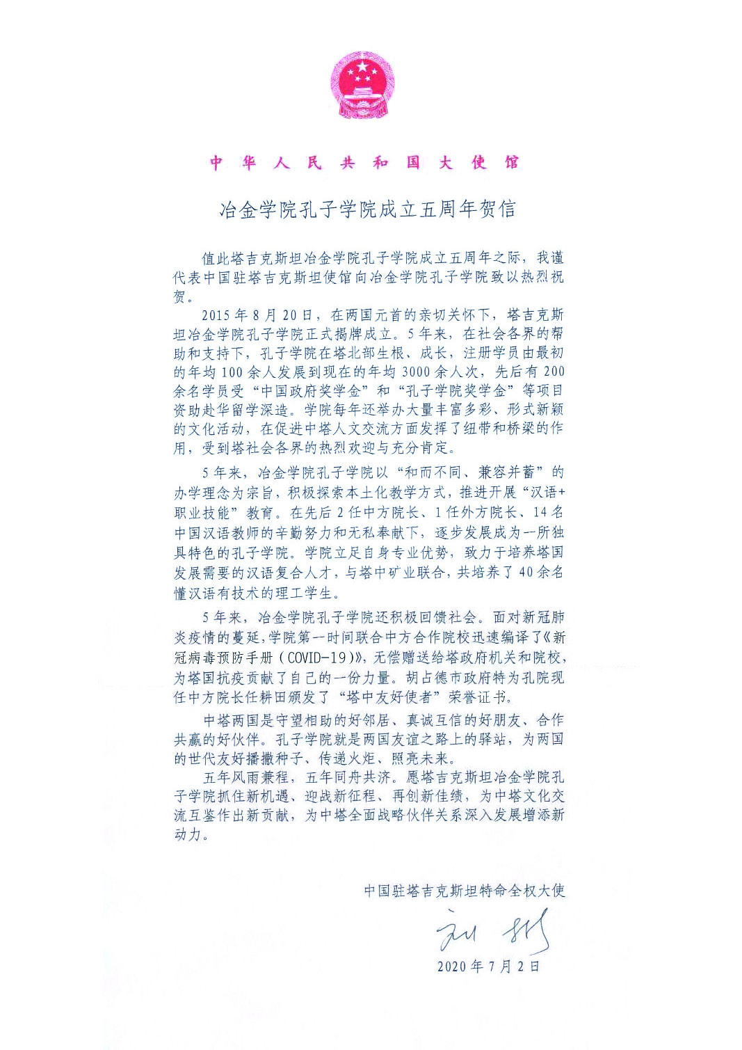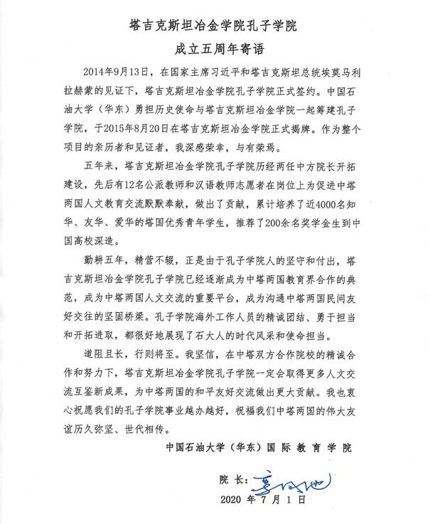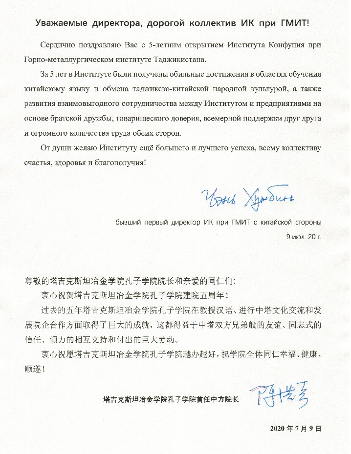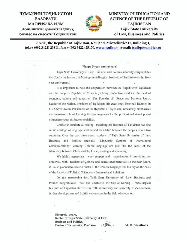 8月20日是我校与塔吉克斯坦冶金学院共建的孔子学院成立五周年的日子。值此五周年院庆之际,来自中塔两国各界的领导、同事和朋友们纷纷发来贺信函件,向孔子学院五周年生日表达祝福。