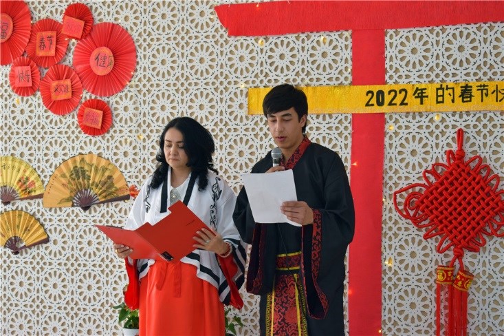 当日下午3点,活动正式开始。活动由孔子学院本土中文教师白 岩龙(ZOIROV JAMSHED)和该校俄语教师穆彬娜(MUQSUDOVNA MUBINA) 主持,通过视频向大家介绍了中国农历新春,用中俄双语讲解了中国 春节传统民俗,展示了中国南北各地穿红衣、贴春联、制冰灯、舞狮 舞龙等传统活动,还展示了春节期间各地的特色美食。2022 年农历壬寅虎年新春撞上北京冬奥会,全球多个国家和地区也共同庆祝中国春节、喜迎冬奥会,全球欢庆的热闹场景也大大调动了活动现场观众的热情。