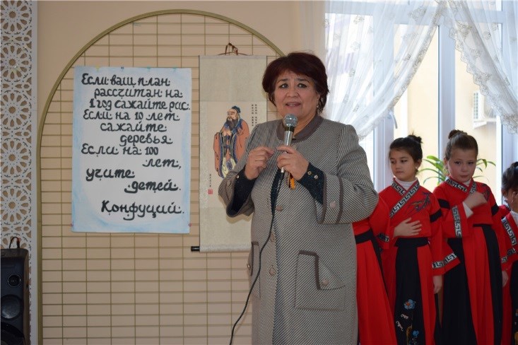 文艺表演结束后,学校校长阿卜杜哈利科夫娜·莎姆斯雅致辞,她强调学校的中文教育发展离不开孔子学院的支持与密切合作,如今学校设置了从幼儿园到高中的全阶段中文课程,在教育部门也完成了备案,学校的中文教学项目已经成当地办学的一个特色。她希望同学们能继续努力,将兴趣真正融入学习和生活,高中毕业后能继续选择到中国留学深造。