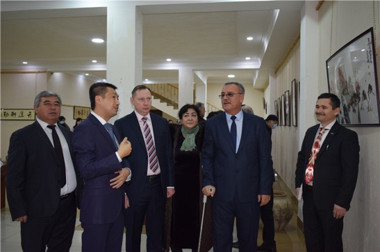 嘉宾致辞后,孔子学院院长任耕田和塔吉克斯坦共和国功勋艺术家、胡占德市somoniyon美术馆馆长朱拉耶夫·贾富尔江共同为此次活动剪彩,书画展正式开幕。随后,活动嘉宾共同走进展厅观看书画和奥运展品。