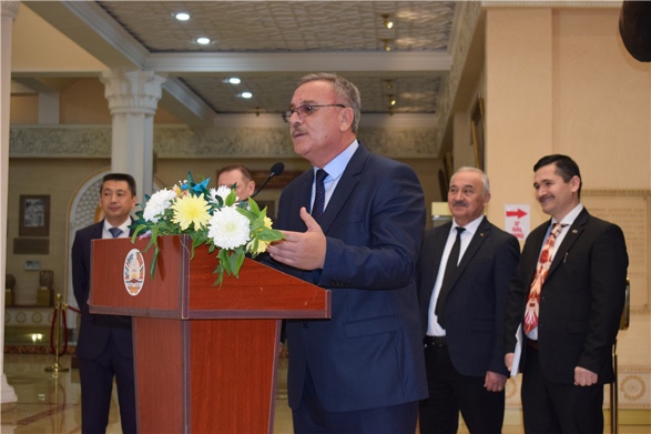 索格特州历史博物馆馆长伊波拉吉莫夫首先致开幕词。他强调,过去的三十年间,塔中两国在各领域合作稳步发展,中国是塔吉克斯坦的“好邻居、真朋友、可靠的战略伙伴”,两国在教育合作和文化交流领域的关系也不断深入。今天举办的画展是索格特地区乃至塔吉克斯坦近年来第一次展示中国书画家的作品,同时也将展示前上海合作组织秘书长阿利莫夫·拉希德捐赠的上还合作组织相关资料以及博物馆收藏的包括鸟巢场馆模型、奥运会火炬等展品,全面立体展示中塔两国三十年来在人文交流领域突出成果。