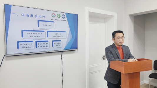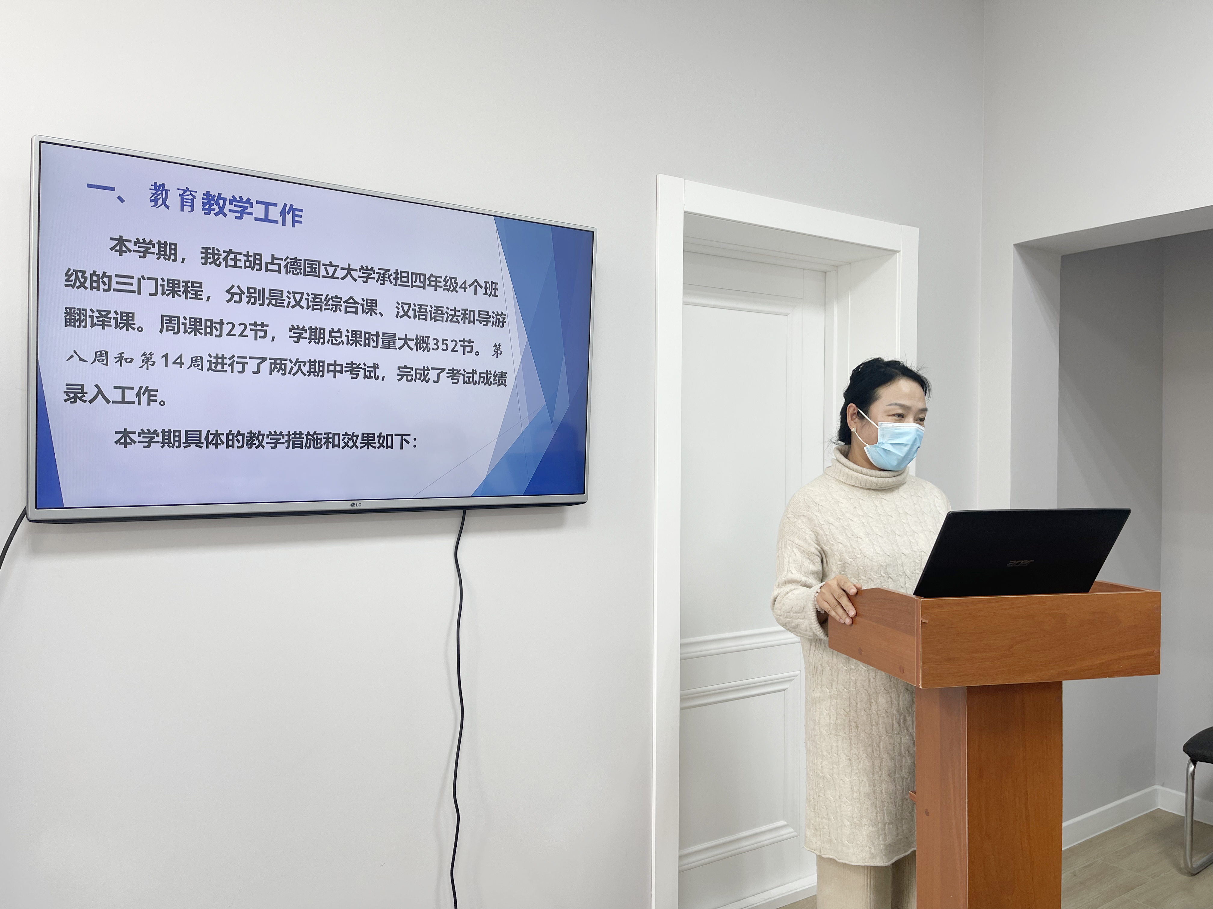 接下来,孔子学院全体教师进行了2022年度工作述职。扎瓦、石光岳、艾明江、马驰、欧林、别威、白敏娜、杨德霞、娜思芭、孟祥凯十位老师就2022年教学工作、科研成果、职业教育、组织开展文化活动工作、取得的荣誉、奖学金推荐工作以及汉语水平考试工作等做了详细汇报。而且大家通过自查在工作中存在的问题和不足并进行了原因分析及提出了改进措施,进一步增强了大家的责任心和使命感。