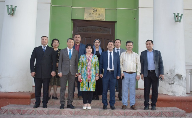 参观结束后,塔吉克斯坦教育和科学部领导与孔子学院工作人员在孔子学院门前合影留念。