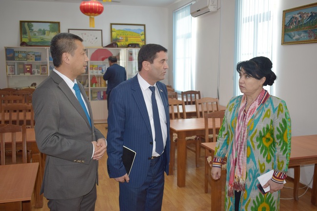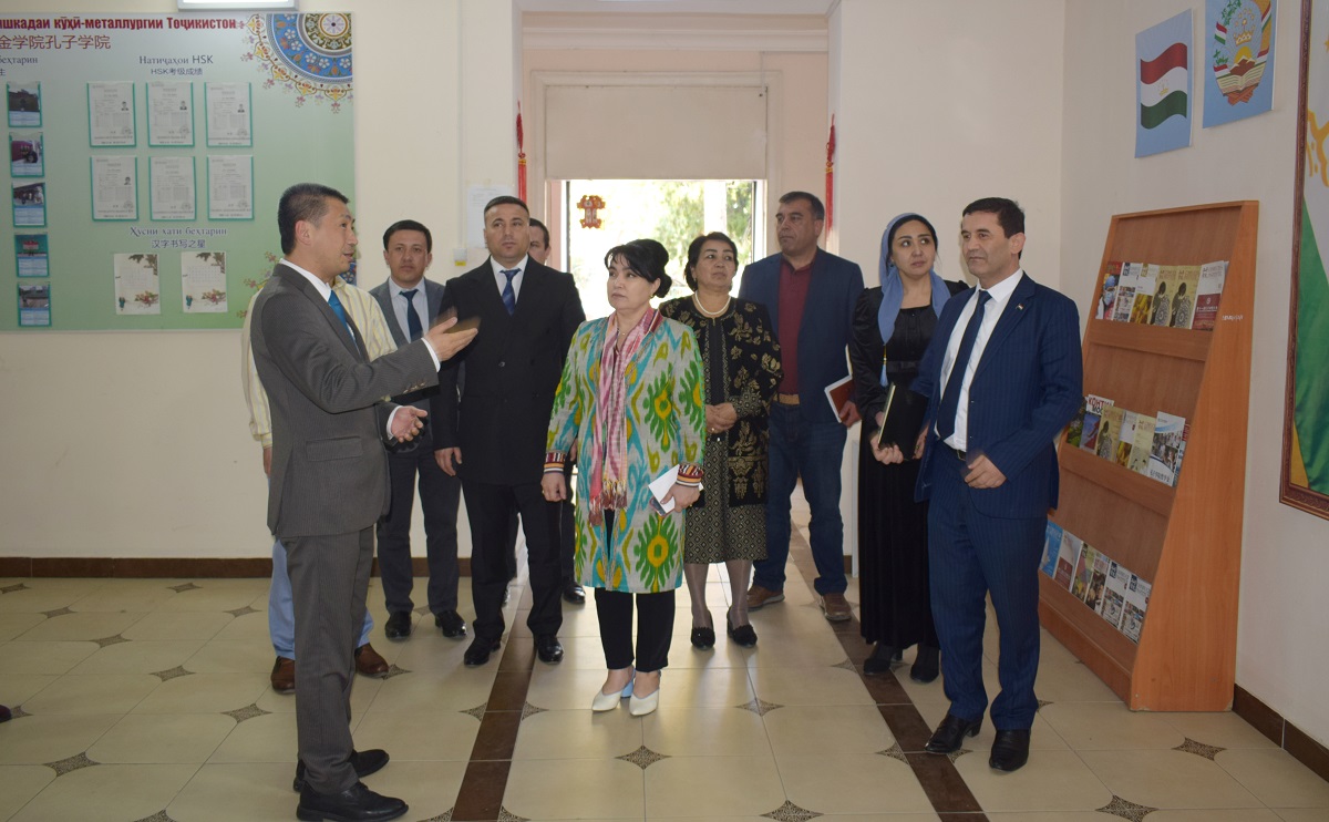 塔吉克斯坦冶金学院校长玛哈玛达利·巴赫提约尔(MAHMADALI BAKHTIYOR)、冶金学院教学副校长纳西里丁诺夫·扎莫尼丁(NASIRIDDINOV ZAMONIDDIN)以及其他校领导陪同参观了孔子学院。