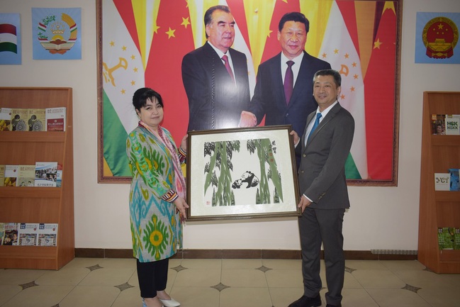 孔子学院中方院长任耕田感谢教育部领导莅临指导工作,祝贺塔吉克斯坦朋友们国际纳吾鲁孜节节日快乐,并向卢特菲亚·阿卜杜霍里克佐达副部长赠送了代表友谊长存的中国国画《国宝熊猫》。