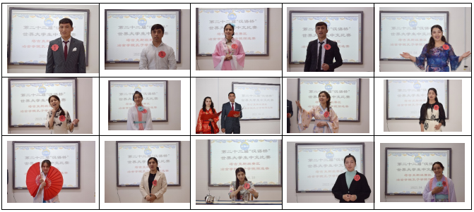 孔子学院中方院长任耕田、塔方院长Valieva Mastura、教学副院长马驰担任评委,来自孔子学院本部和下设中文教学点胡占德国立大学、塔吉克斯坦国立政法商业大学共计14名选手参加预选比赛。