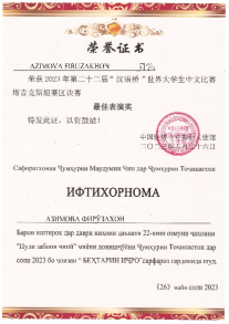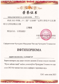 经过四个环节的激烈比拼,我院推荐参赛选手兰花(MIRZOBOBOEVA ZARNIGOR)荣获季军、优汩(AZIMOVA FIRUZAKHON)荣获最佳表演奖。