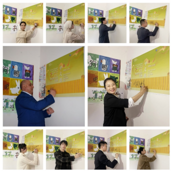 教师代表白敏娜向全体来宾简要介绍了“国际中文日”的设立背景与当代意义,引导大家共同思考语言背后的文化价值。文化墙展出的学员原创汉字海报作品巧妙地融合了图像与文字,生动呈现对中国文字的理解与艺术表达。