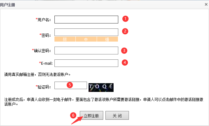 在出现的注册窗口中输入用户名、密码、Email以及验证码信息,然后点击 “立即注册”。