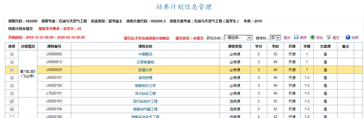 系统操作:培养——培养计划信息管理——选择研究方向——勾选课程