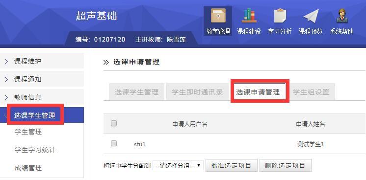 学生端申请完毕后需要及时沟通任课老师,批准选课申请。教师进入课程后台,点击“选课学生管理---选课申请管理”,批准学生申请即可。