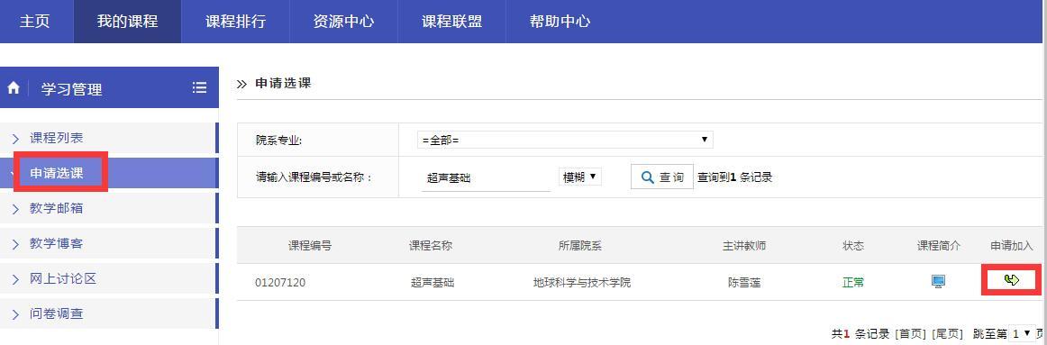 下面介绍一下学生如何自己申请加入课程。登陆云课堂,点击“学习管理---申请选课”,搜索要学习的课程,申请加入即可。