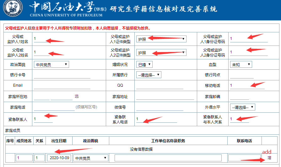 2、输入家庭信息,红色箭头指示为必填项。完成最后一行家庭成员信息后,根据需要点击右侧的“增”按钮,增加家庭成员信息。