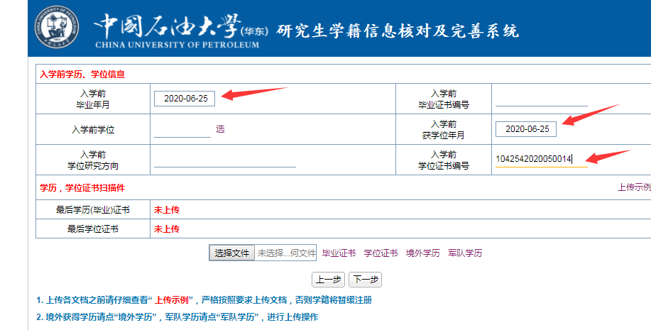 1、在注册页面输入自己前置学位毕业日期、获得学位日期以及学位证书编号。