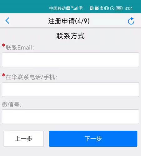 ● 填写联系方式,包括EMAIL,电话,微信号(选填),点击下一步。