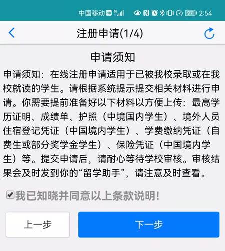 ● 仔细阅读以下出现窗口中的申请须知,并勾选“ 我已经知晓并同意以上条款说明”,然后点击“下一步”。